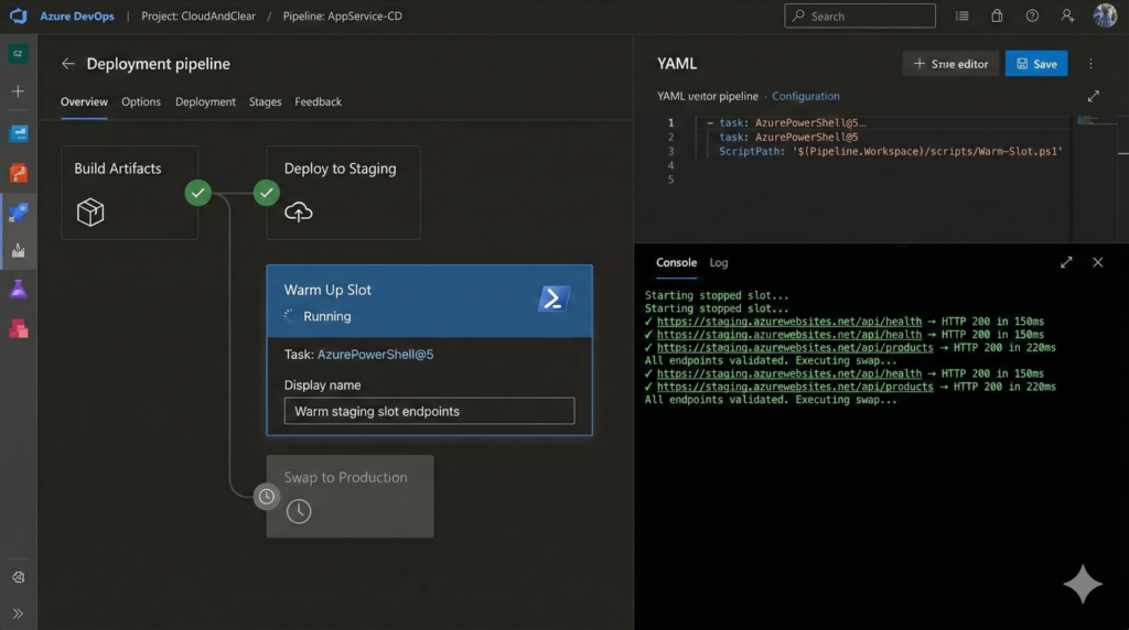 This PowerShell script handles the complete warm-up lifecycle, validating slot health, warming endpoints sequentially with exponential backoff, and executing conditional swaps based on warm-up success: