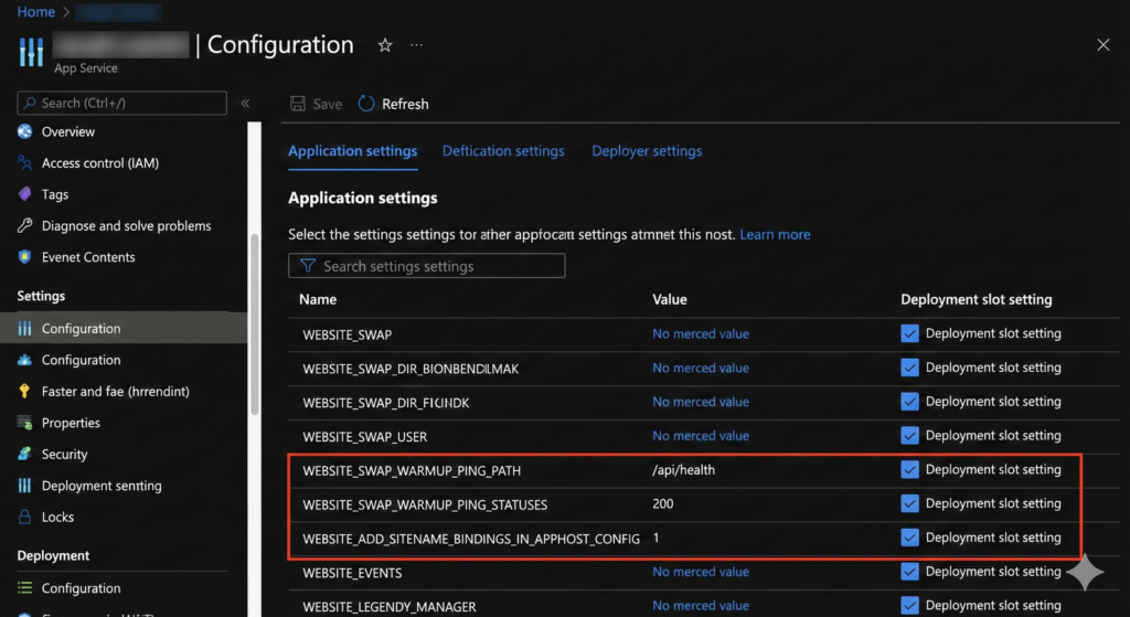 Three platform settings transform slot warming from partial solution to complete production readiness. Set WEBSITE_SWAP_WARMUP_PING_PATH to your actual health check endpoint (like /api/health) rather than accepting the default / root path. Configure WEBSITE_SWAP_WARMUP_PING_STATUSES to 200 so Azure only considers genuine success responses as warmed up, not 301 redirects or 500 errors. Mark both settings as slot-specific so they persist across swaps.