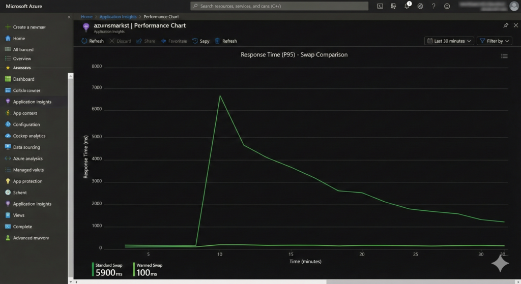 The financial cost appears in monitoring dashboards as degraded user experience and in Application Insights as p95 response time spikes exceeding 5-10 seconds during “successful” deployments. For e-commerce platforms processing hundreds of transactions per minute, even a 30-second degradation window translates to abandoned carts and lost revenue.