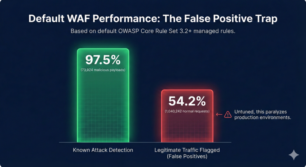 Default OWASP Core Rule Set 3.2+ managed rules achieve extraordinary coverage across SQL injection, XSS, remote code execution, and protocol attacks. Independent testing using 73,924 malicious payloads confirmed 97.5% detection. The problem emerges with legitimate traffic: those same rules flagged 54.2% of 1,040,242 normal requests as malicious. Authentication tokens trigger SQL injection rules, API parameters match XSS patterns, and legitimate user-generated content trips remote code execution detection.