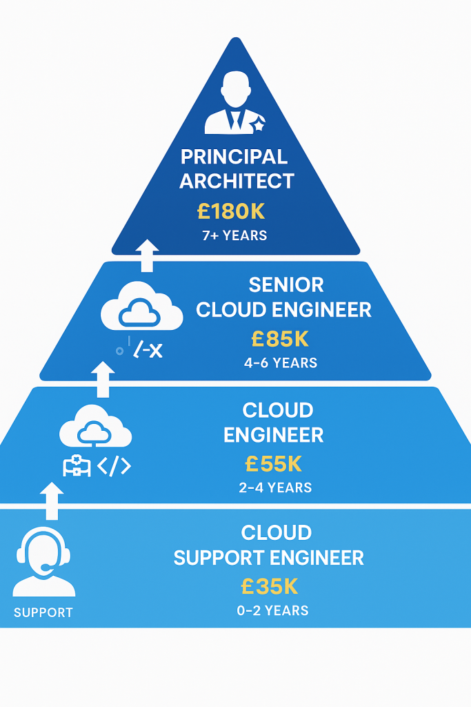 Picture this: You’re starting as a cloud support engineer earning £45,000, answering tickets and troubleshooting basic issues. Fast-forward seven years, and you’re designing enterprise cloud architectures earning £200,000+ annually whilst shaping digital transformation strategies for major organisations. This isn’t just a career progression—it’s a strategic journey that thousands of cloud professionals navigate successfully each year.