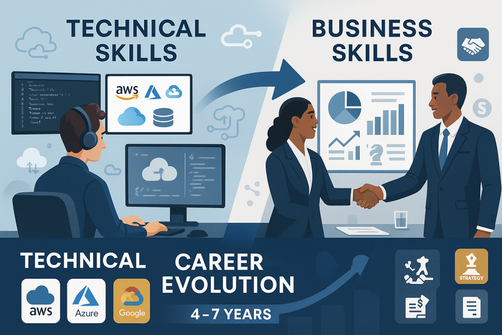 The transition to architectural roles represents the most significant career milestone, typically occurring after 4-7 years of progressive cloud experience. This transition requires developing business acumen, communication skills, and broad technical knowledge across multiple domains.