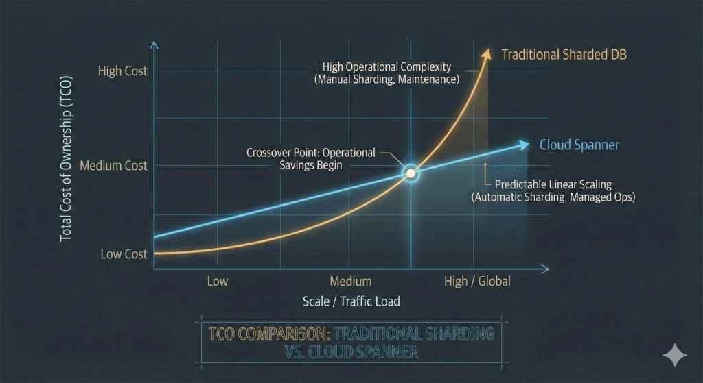 TCO exceeds compute costs: When total ownership costs (including engineering time, downtime incidents, and scaling complexity) exceed what a simpler database saves in compute pricing. Organisations spending £200,000+ annually on database operations often find Spanner reduces total costs despite higher compute pricing.
