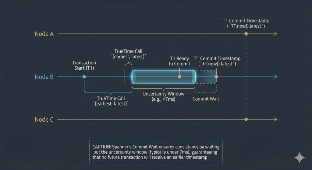 This tight uncertainty window enables Spanner’s commit-wait mechanism. When a transaction commits, the Paxos leader assigns a timestamp at TT.now().latest and waits until TT.after(commit_ts) returns true, ensuring no future transaction receives an earlier timestamp. The practical latency cost? Typically negligible, because the wait overlaps with Paxos replication time. Google’s engineers note that “the vast majority of the time, Spanner’s commit wait step involves no waiting.”