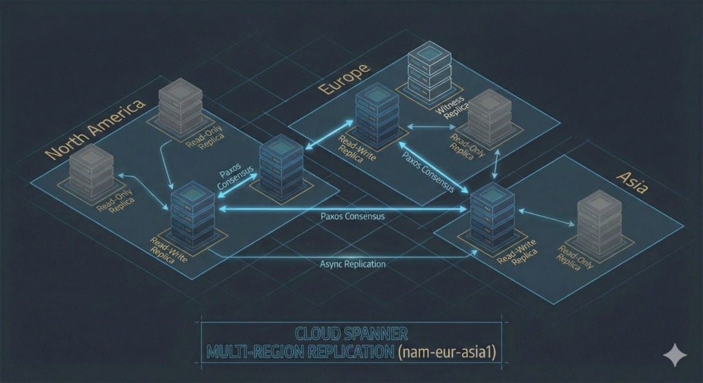 The system supports three replica types with distinct cost and performance characteristics. Read-write replicas store full data copies and participate in Paxos voting. Read-only replicas serve reads without affecting write quorum latency, enabling global read performance without the cost of full replication. Witness replicas vote in Paxos but don’t store full data copies, reducing storage costs whilst maintaining write quorum requirements.