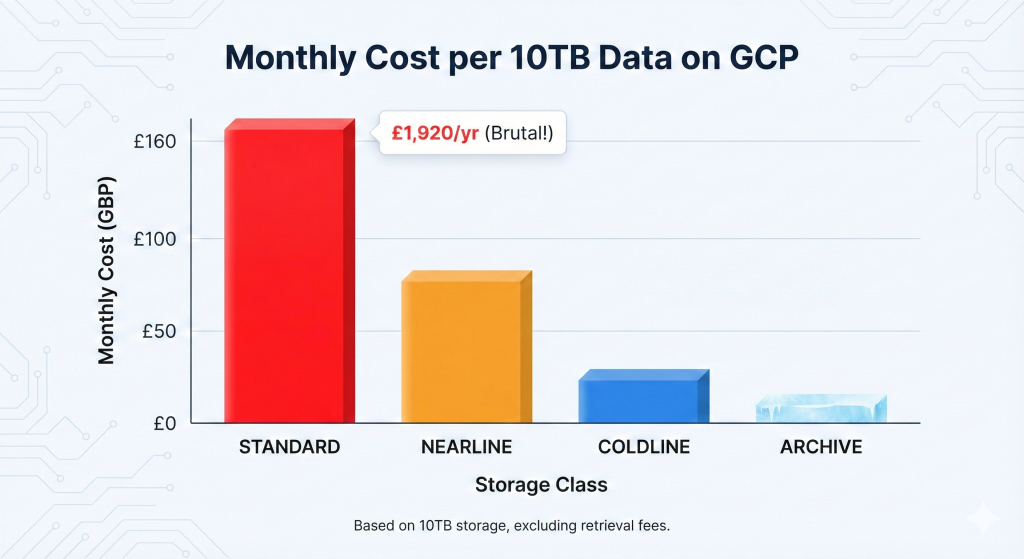 Most teams create buckets, upload objects, and forget about them. Six months later, logs nobody accesses consume Standard storage at £0.016/GB/month when Coldline at £0.003/GB/month would handle the workload perfectly. The mathematics become brutal at scale: a mere 10TB of stale Standard storage costs £1,920 annually versus £360 in Coldline.