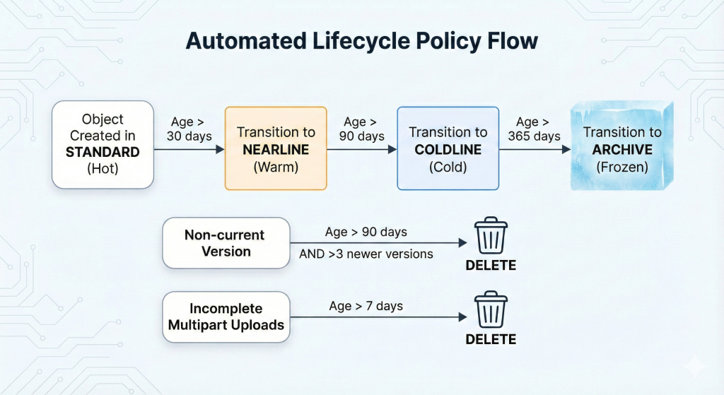 Enterprise environments with diverse data retention requirements benefit from programmatic lifecycle management. This Python script using the Cloud Storage client library creates tailored policies based on bucket metadata: