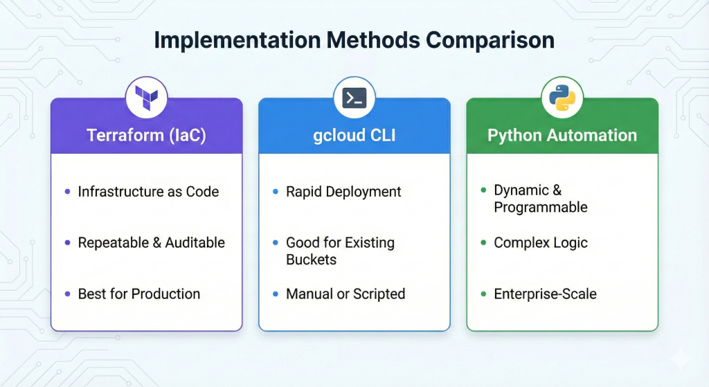 Implementation through Terraform ensures repeatability and audit compliance whilst gcloud CLI provides rapid deployment for existing infrastructure. Python automation enables sophisticated policy management for diverse data classifications across enterprise environments. The combination of automated transitions, version clean-up, and failed upload deletion eliminates three common sources of storage waste simultaneously.