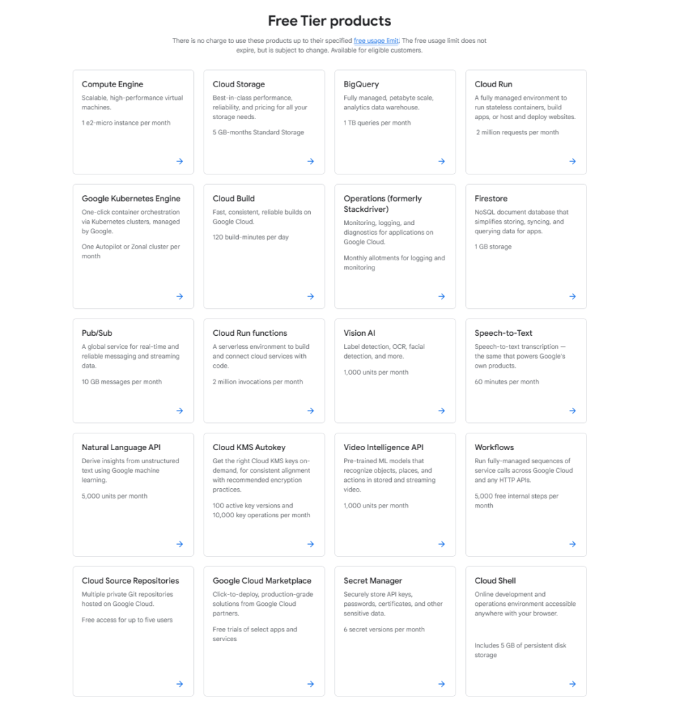 - Cloud Run for containerized applications (2 million requests monthly)